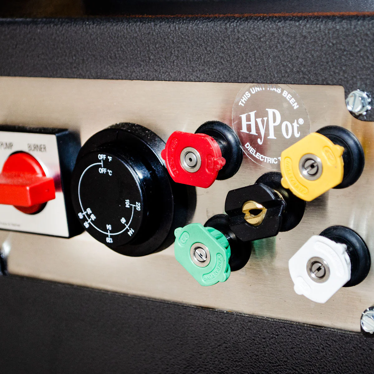 Equipped with an adjustable thermostat that can provide heat up to 200° F, this model is extremely powerful and blast away the toughest dirt, grime, grease and more. We recommend running the burner at 180° F when using this machine for any period of time to allow the oil-fired burner to operate correctly. A 20° variance on output temperature above/below ambient air temperature can be expected.
